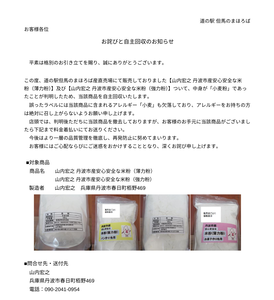 この度、道の駅但馬のまほろば産直売場にて販売しておりました【山内宏之 丹波市産安心安全な米粉(薄力粉)】及び【山内宏之 丹波市産安心安全な米粉(強力粉】について中身が「小麦粉」であることが判明したため、当該商品を自主回収いたします。